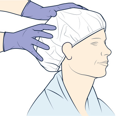 Sau khi sưởi ấm, đặt mũ dầu gội trên đầu (mái tóc dài hơn đòi hỏi người dùng phải bọc tóc trên đầu trước khi đặt).1-2 phút cho tóc ngắn hơn, 2-3 phút cho mái tóc dài hơn). Sự rối loạn quá mức hoặc vật chất lạ trong tóc có thể đòi hỏi thời gian mát xa dài hơn hoặc sử dụng nhiều hơn một nắp dầu gội để hoàn thành quá trình làm sạch.